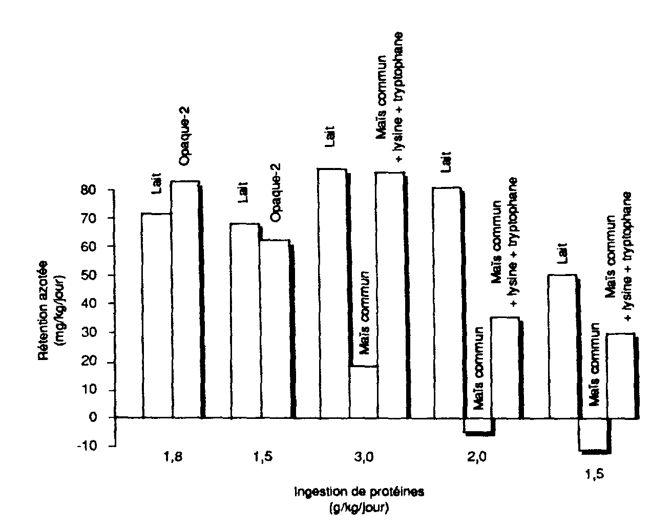 Dans une étude conduite par Luna-Jaspe, Parra et Serrano (1971), la rétention azotée du maïs commun, du maïs opaque-2 colombien (ICA H208) et du lait a été comparée chez trois enfants de 24 à 29 mois, pesant de 5,9 à 10,1 kg. L'apport protéique et calorique était d'environ1g et 100 calories par kilogramme de poids corporel et par jour. La rétention azotée était négative lorsque les enfants recevaient le mais opaque-2. Toutefois, le maïs commun entraînait un chiffre encore plus faible ou plus négatif. Lorsqu'on a donné du lait à ces enfants, l'un d'entre eux a présenté un bilan négatif et les deux autres un bilan positif, le bilan moyen étant positif.