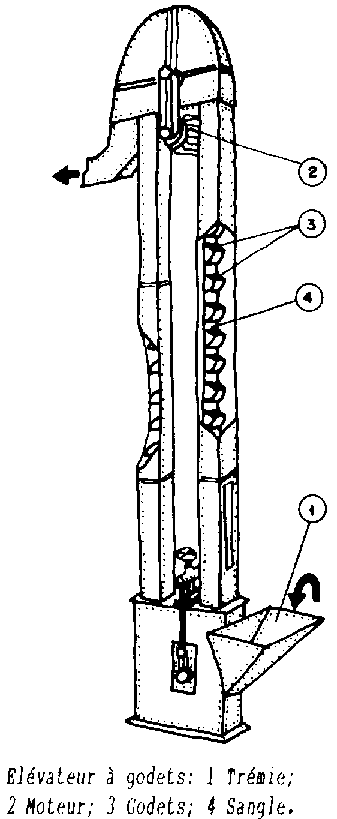 Les élévateurs à godets sont utilisés pour le déplacement vertical (10 degrés d'inclinaison au maximum), et sont composés d'une courroie sans fin munie de godets et tendue verticalement entre deux poulies.