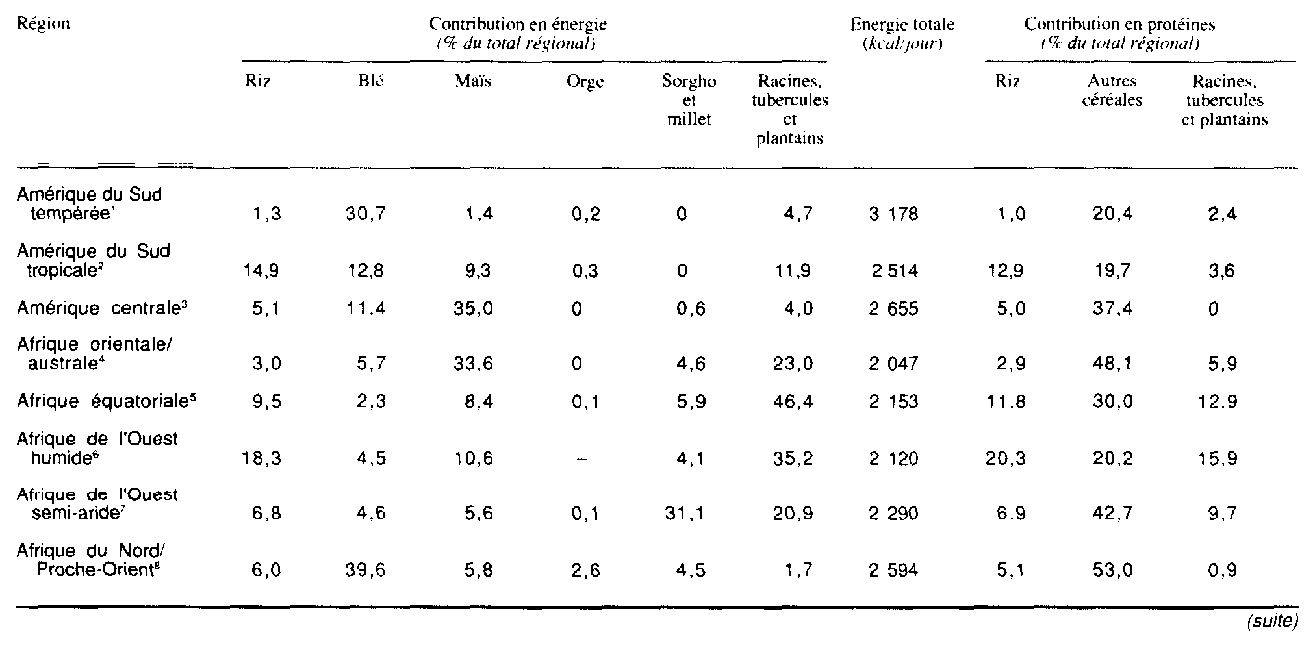 Les bilans de disponibilités alimentaires de la FAO pour 1979-1981 indiquent que la contribution protéique du riz au régime alimentaire était de 69,2 pour cent en Asie du Sud et de 51,4 pour cent en Asie du Sud-Est (FAO, 1984) (tableau 7). Ces pourcentages dépassent la contribution de n'importe quelle autre protéine céréalière dans n'importe quelle région du monde.