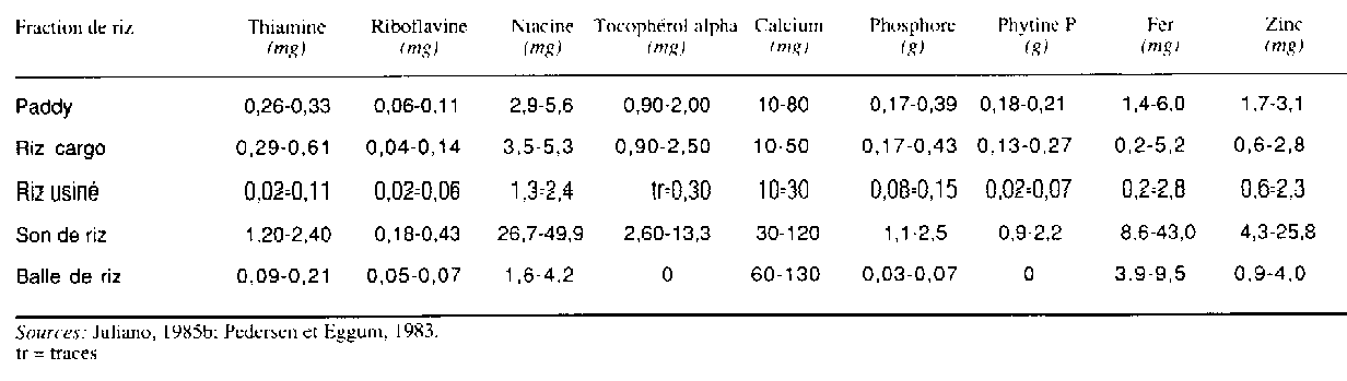 Les minéraux (cendres) sont également concentrés dans les couches extérieures du riz cargo ou dans la fraction constituée par le son (tableau 15). Une forte proportion (90 pour cent) du phosphore du son est du phosphore de phytine. Les principaux sels de la phytine sont des sels de potassium et de magnésium. Dans le riz cargo, les principes minéraux sont répartis à raison de 51 pour cent dans le son, 10 pour cent dans le germe, 10 pour cent dans les résidus de polissage et 28 pour cent dans la fraction correspondant au riz usiné; la distribution est identique pour le fer, le phosphore et le potassium (Resurrección, Juliano et Tanaka, 1979). Toutefois, certains minéraux accusent une distribution relativement plus uniforme dans le grain: le riz usiné retenait 63 pour cent du sodium, 74 pour cent du calcium et 83 pour cent de la teneur en azote Kjeldahl du riz cargo (Juliano, 1985b).