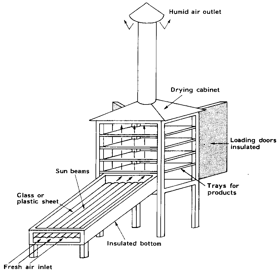 DECRIPTION OF AN INDIRECT DRIER (see Figure 1 - Indirect solar drier showing external air heater, cabinet drier with trays and chimney for extraction of humid air.)