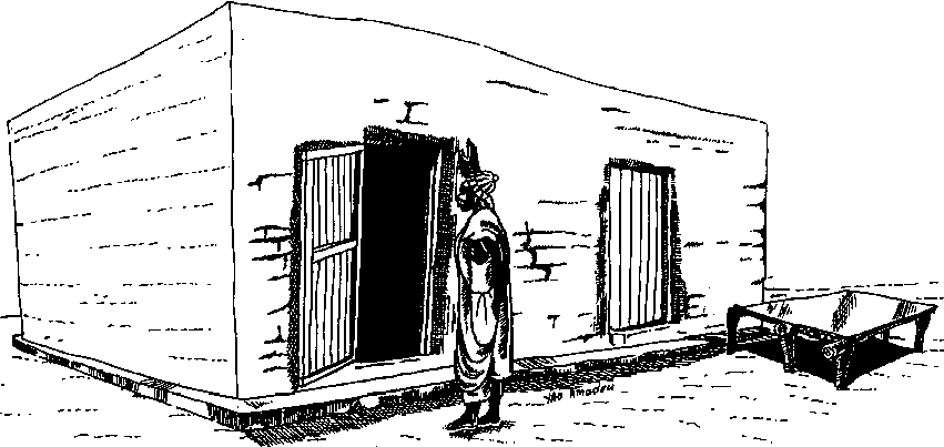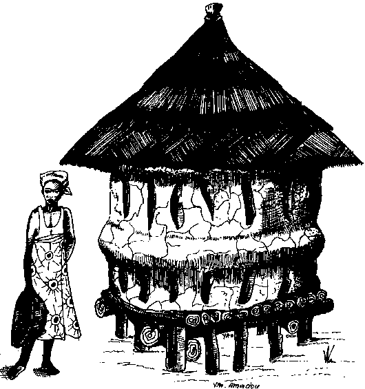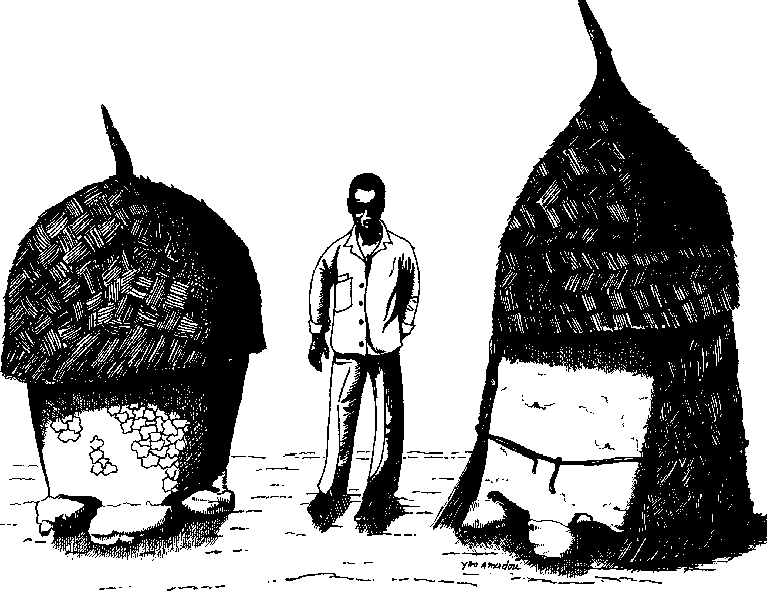 L'habitat de la grande famille Dagari, souvent isolé en plein champ, ressemble à une forteresse carrée en banco aux dimensions imposantes. Une seule porte permet l'accès à la cour intérieure, complètement entourée par les pièces d'habitation. Le grenier, invisible de l'extérieur comme de l'intérieur de la cour, fait partie intégrante de cet ensemble architectural. Il occupe totalement une pièce, avec une seule ouverture au sommet, débouchant: sur la terrasse et couverte d'un petit chapeau de paille. Ainsi protégé des intempéries, le grenier peut durer, selon les villageois Dagari, plus de 50 ans (cf. figure B.8).