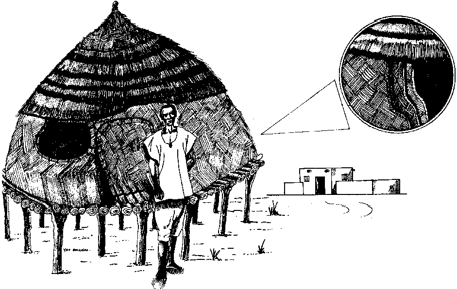 entièrement construit en matériaux végétaux. Il comprend une plate-forme, relativement surélevée (70 à 80 cm), qui le prémunit utilement contre les remontées d'humidité du sol mais surtout contre les dégâts risquant d'être provoqués par les ânes, les chèvres et: les moutons. Cette plate-forme, faite de poutres et: poutrelles en bois, est soutenue par de solides poteaux en forme de fourche. Le corps du grenier et la toiture qui ne font qu'un, sont constitués de trois couches de tiges superposées de la façon suivante: à l'intérieur, une couche de secco, au milieu, des tiges de mil, à l'extérieur, une couche de paille retenue solidairement à la plate-forme à l'aide de fibres végétales.