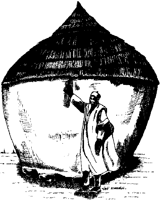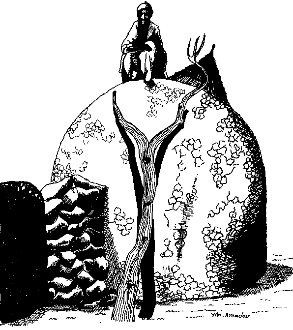 Plus au nord, près de Tahoua, la structure du grenier est plutôt sphérique (cf. figure H.5) et repose simplement sur un lit de grosses pierres, sans plate-forme en bois. Elle présente deux autres différences par rapport au type de grenier précédent: d'une part, la présence d'une ouverture latérale, à mi-hauteur, s'ajoutant à l'ouverture du sommet; d'autre part, l'absence de jupe de chaume sur la partie supérieure du corps du grenier.