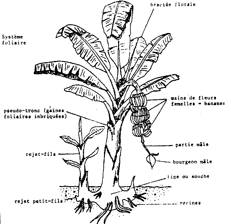 Figure 2: Schéma général d'un bananier en phase de fructification (LASSOUDIERE, 1978)