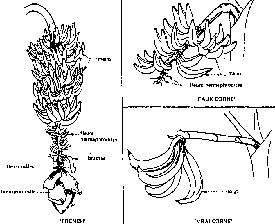 Les plantains vrais sont des triploides AAB et se divisent en << French plantain >> (plantains Français) et << Horn plantain >> (plantain Corne). Dans chacun de ces types on rencontre un grand nombre de variétés (cultivars). Le régime de plantain type French possédé un axe mâle persistant, alors que celui du type Corne est absent ou dégénère très tôt aprés la floraison (figure 3). Plusieurs clones de ces plantains se différencient essentiellement par le nombre de mains, la taille du fruit et du régime: on trouve des petits Frenchs, des Frenchs moyens, geants, des faux Cornes, des vrais Cornes.
