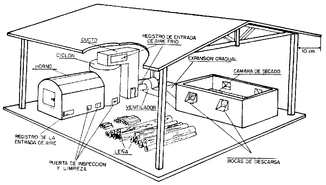 Horno para calentamiento del aire. Para calentar el aire se puede utilizar cualquier tipo de horno o quemador. El combustible que se utiliza depende del tipo de horno o quemador y pueden ser los subproductos agrícolas, la leña, derivados del petróleo, gas metano, propano, etc. En el Brasil, donde está prohibida la quema de combustibles derivados del petróleo para el secado de productos agrícolas, se emplea la leña como combustible en la mayoría de los hornos de los secadores. En los países con problemas de deforestación se recomienda utilizar otros productos como la cascarilla de arroz, paja, residuos de mazorcas, etc.