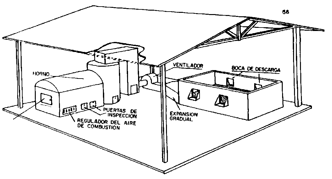 Descripción y aspectos generales. El secado de lotes de granos y semillas en un secador de lecho fijo es una operación simple. El costo inicial para la instalación de este sistema de secado puede estar al alcance de la gran mayoría de los agricultores, ya que es más bajo que el de un secador comercial. Otro aspecto interesante de este tipo de secador es su versatilidad, puesto que se pueden secar diferentes granos y semillas: café en "cereza", frijol en vaina, maíz en mazorca, yuca en trozos y cacahuate en rama o desgranado. Este tipo de secador también puede ser utilizado para curar bulbos de ajo y cebolla. Las partes que componen el secador de lecho fijo son: i) la cámara de secado, ii) un piso de lámina o chapa metálica perforada, iii) una cámara de distribución del aire con expansión gradual, iv) un ventilador para mover el aire y v) un horno de calentamiento. La construcción en su mayor parte es de albañilería (figura 24).