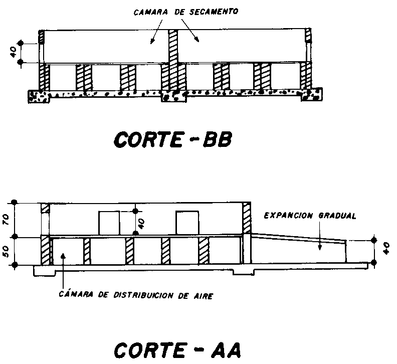 Cámara de secado. La cámara de secado se encuentra arriba de la chapa perforada y en ella se coloca el material que va a ser secado. Sus dimensiones varían en función de la cantidad de granos que se va a secar. En el Brasil, por lo general se utiliza una capa de granos de 0,40-0,60 m de altura, ya que si se secan los granos con una altura superior se pueden presentar problemas de falta de uniformidad en el secado. Para evitar este problema se recomienda revolver los granos a intervalos regulares, de modo que al final del proceso su contenido de humedad sea uniforme. Si la capa de granos es muy alta, es difícil revolver los granos en forma manual. La altura de la cámara de secado es de 0,70 m y debe estar provista de puertas en sus paredes laterales con el objeto de permitir la descarga y el envasado del producto, y se deben colocar deflectores en sus esquinas para evitar la canalización del aire.