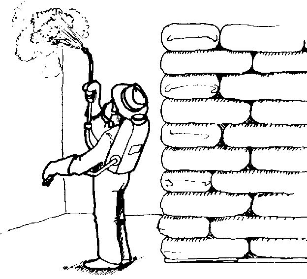 Pulverización residual o aspersión. El insecticida se mezcla con agua u otro líquido. Se pulveriza en las paredes, pisos, entarimados, techos, equipos existentes dentro del almacén y alrededor de la unidad de almacenamiento con la finalidad de exterminar los insectos que se esconden en depresiones, orificios, y grietas. Estos insecticidas poseen cierto poder residual, que mata los insectos que se posen en el sitio tratado, ano en días después de haber sido aplicados (ver cuadro 2 y figura 19).
