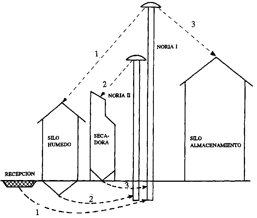 Además de la amortización e interés de la secadora propiamente dicha, se deben agregar los costos de la noria elevadora que alimenta exclusivamente a la secadora, y los correspondientes al silo o silos de granos húmedos (si ellos fueran usados). En un proceso como este último hay que añadir el costo de otra noria, encargada de llenar los silos de húmedo. Si se trabajara sin interrupción, es posible que se requiera una tercera noria para llevar el grano seco de la secadora a los silos de almacenamiento definitivo. Sin embargo, el costo de esta última no debiera incluirse, pues representa el ingreso normal de grano seco a la planta (Figura 88).