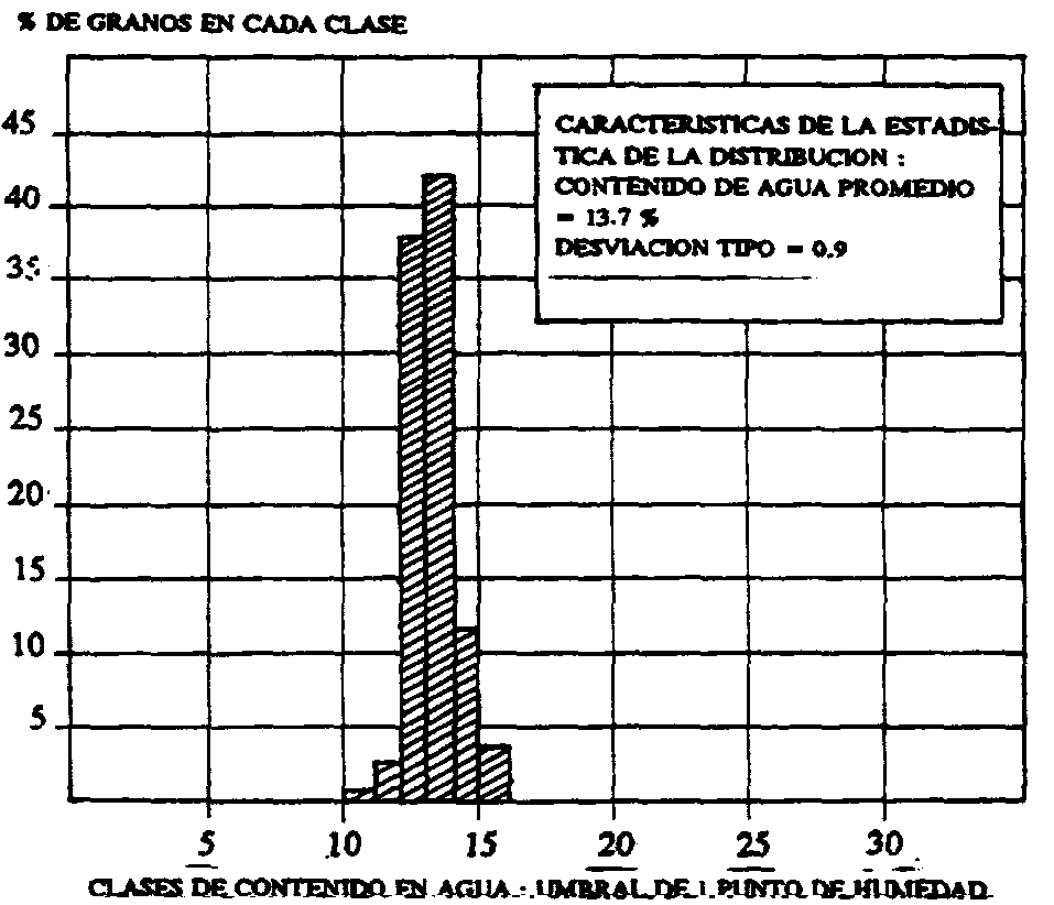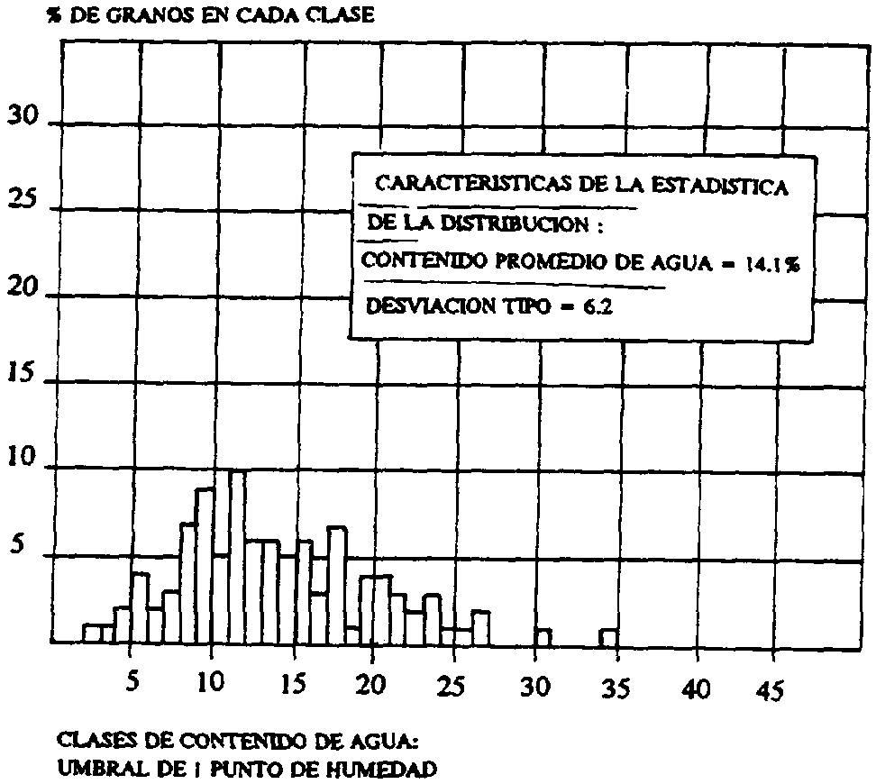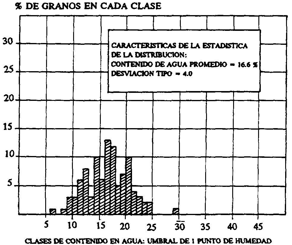 Con los datos de las 100 semillas se puede elaborar UD histograma como el de la Figura 90 que representa a una secadora "mediocre", con UD intervalo tipo de 6,2 puntos de humedad (análisis estadístico). La Figura 91 representa una secadora de comportamiento "medio", con un intervalo tipo de 4 puntos de humedad. La Figura 92 muestra una maquina de mucho mejor comportamiento, con un intervalo tipo de solo 2 puntos.