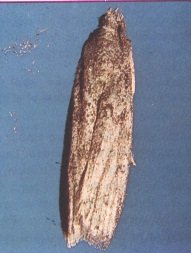 Endrosis sarticella. Polilla de los productos almacenados en las despensas, en almenó dra, nuez, fríejol, en las reglones del Aconcagua, Valparaíso, Santiago, e Islas de Pascua y Juan Fernández.