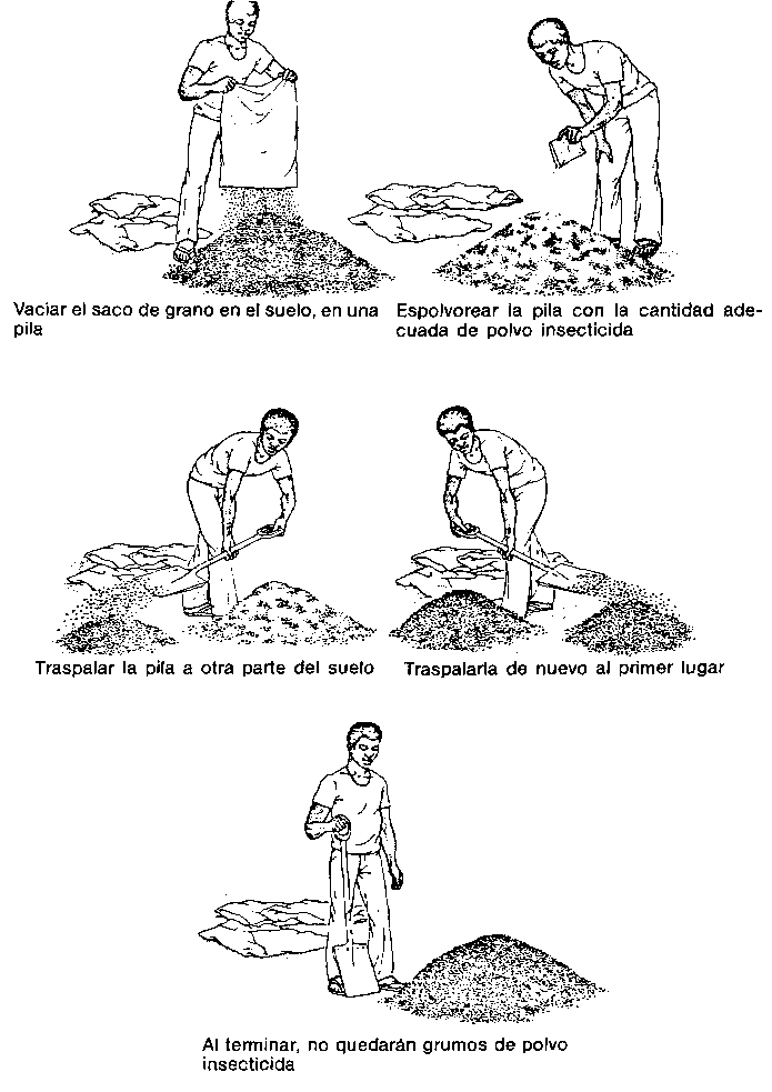 El rociado o espolvoreado de los estratos de sacos con insecticidas (según se muestra en la figura) es menos peligroso para las personas, pero no siempre resulta muy eficaz. No obstante, últimamente, con la aplicación de pirimifos-metilo (como concentrado emulsionable, Actelic 50 ec) sin diluir (50 EC) en dosis de 2 ó 3 pasadas por saco, con un aplicador doméstico sencillo, se eliminaron casi completamente los gorgojos en sacos de maíz muy infestados, y se mantuvo controlada la población a un nivel muy bajo incluso después de ocho meses. Pero la aplicación de insecticidas no diluidos constituye siempre un peligro.
