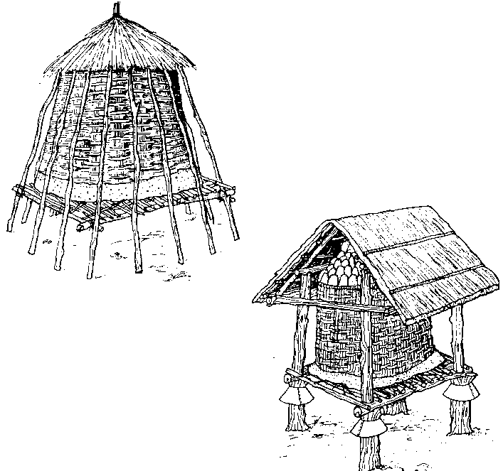 En las zonas tropicales húmedas se utilizan extensamente estructuras redondas de paredes apersianadas. Varían de I a 3 metros de diámetro y hasta 2,5 metros de altura. Se emplean tarimas para almacenar las mazorcas de maíz con las espatas, dispuestas a menudo en una forma especifica, y se puede encender fuego debajo de las tarimas. Un tejado de paja proporciona protección contra la lluvia.