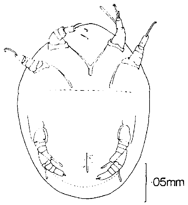 La placa dorsal del propodosoma es casi de forma triangular y parcialmente cubre la parte del gnatosoma.