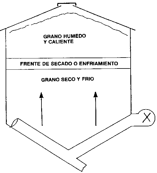 En los silos donde el aire se insufla (de abajo hacia arriba) el enfriamiento (y el secado) del grano se realiza por medio de un frente de enfriamiento y secado que va avanzando hacia arriba (figura 13). Se considera que el periodo ha terminado cuando la humedad y la temperatura del grano en la parte superior están en equilibrio con el aire exterior, lo que significa que todo el frente de enfriamiento y secado llegó arriba. En ese momento puede pararse la aireación .