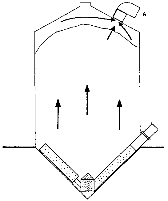 En caso contrario si se aspira el aire, hay que esperar que todo el silo esté lleno, e iniciar la aireación una vez que el grano que se encuentra en las capas superiores ha estado en reposo por lo menos cuatro horas. Si se comenzara antes, el grano de la parte superior quedaria expuesto al fisurado (cuarteado, estrellado), al sobresecado y al revenido ulterior.
