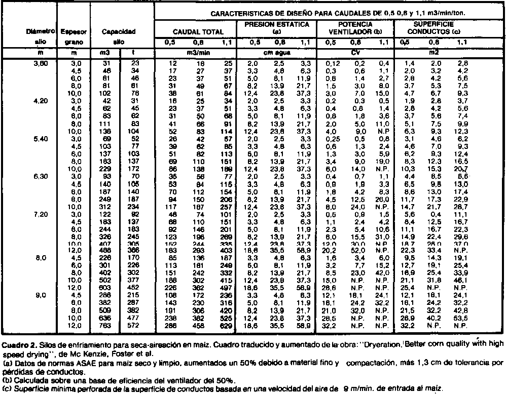 El cuadro 2 muestra los datos mas importantes para la elección y diseño de los silos de seca-aireación tomando como base el maíz. Se establecen los distintos tamaños de silos, sus capacidades y las alturas respectivas de grano. Para tres diferentes caudales unitarios de aire, se fijan los valores de caudales totales, presiones estáticas, potencias requeridas, y superficies necesarias de conductos para el aire.
