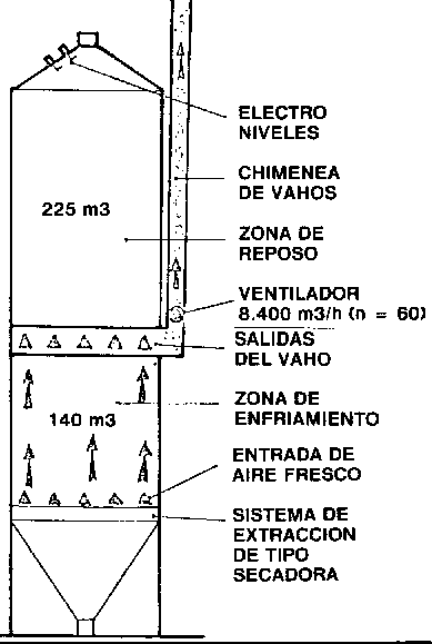 Estos silos, llamados "enfriadores continuos", como se ilustra en la figura 17, están formados por una cámera superior que recibe el grano proveniente de la secadora y donde éste va descendiendo al tiempo que sufre el periodo de reposo. Luego llega a la zona de enfriamiento que tiene caballetes similares a los de una secadora, por los que desciende el grano y recibe la corriente de aire en forma de contracorriente (de abajo hacia arriba).