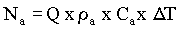 La potencia que hay que transferir al aire por el sistema de calentamiento, Na, expresada en watts, se determina por el incremento de temperatura, AT en °C, del flujo de aire, Q, en m3/s, de la masa especifica del aire, pu, en kg m3, y de la entalpia específica del aire, Ca, en J/kg. OC por medio de la ecuación: