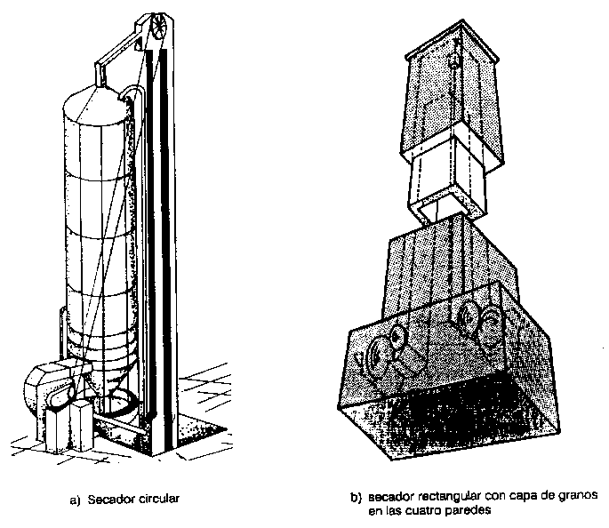 La torre puede ser circular, con la capa de granos rodeando el quemador y el ventilador, o bien rectangular, con columnas de granos en dos o en los cuatro costados. En la Figura 18 se presentan esquemas de estos tipos de secadores.