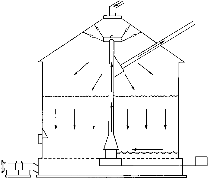 El secado en silos se puede considerar secado en flujos contrarios, cuando se utiliza un tornillo sin fin que gira lentamente sobre el fondo perforado y retira los granos parcialmente secos, los que pasan a otro silo. La zona de secado permanece prácticamente estacionaria y próxima a la entrada del aire de secado en la masa de granos. El enfriamiento posterior de los granos se efectúa en otro silo, donde se termina el secado. En la Figura 26 hay un esquema de dicho sistema de secado.