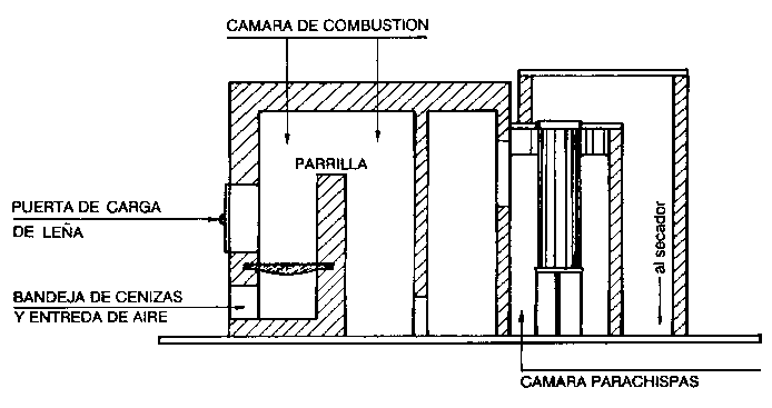 La Figura 32 es un esquema de un tipo de horno adecuado para quemar lena trozada. En los hornos de carga manual las parrillas no deben tener más de 2 m. de largo. Deben estar dotadas de una puerta de carga por cada metro de ancho, para facilitar la carga de leña.