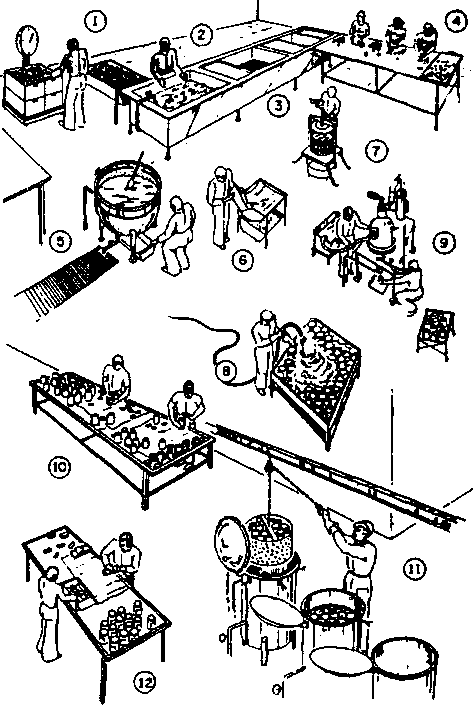 La Figura 5 muestra un dibujo del proceso de conservería y elaboración de concentrados en el cual se puede observar un manejo a mayor escala que en un proceso artesanal, en él se puede apreciar que, con excepción del concentrador al vacio (9), el resto del equipo es bastante similar al analizado en el punto anterior, con una notoria diferencia de tamaño pero con los mismos principios.
