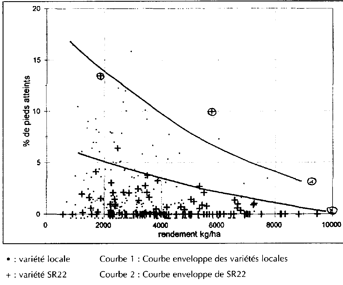 Les résultats permettent de noter une relation négative nette entre le taux d'infestation (exprimé en pieds atteints par segment de ligne de maïs) et le rendement en grains (figure 7, courbe enveloppe supérieure).