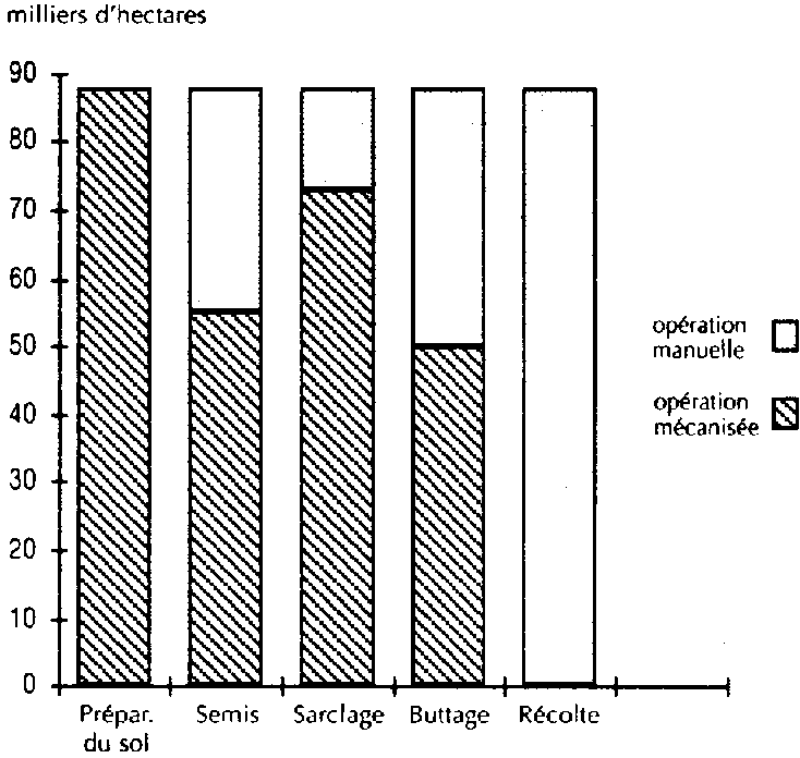 Figure 2. Mécanisation des opérations culturales sur maïs encadré par la CMDT au Mali, en 1991.