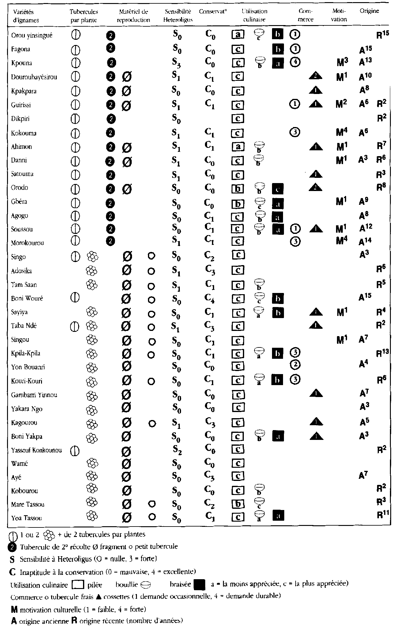 Quarante deux variétés, rattachées à quatre espèces d'ignames ont été recensées: soit 36 variétés de D. cayenensis-rotundata, quatre de D. alata, et une de D. dumetorum et de D. bulbifera. L'espèce D. cayenensis-rotundata est, de très loin, la plus riche sur le plan de la biodiversité. Elle est séparée en deux groupes variétaux par le cultivateur bariba. Ce sont Tam dwé et Yassounou. Ces deux groupes correspondent à des formes d'exploitation différentes mais complémentaires en matière d'approvisionnement vivrier. Les Tam dwé réunissent les variétés exploitées en double récolte (fin juin à mi-octobre). Ce groupe compte 16 variétés. Les Yassounou recouvrent les ignames exploitées en récolte unique (décembre à janvier). On a ici 20 variétés. Il n'y a pas toujours une limite rigoureuse entre ces deux groupes variétaux. Les variétés Boni Wouré, Singou et Sayiya peuvent passer d'un groupe à l'autre selon les conditions de culture qui prévalent ou encore selon les techniques culturales mises en oeuvre. D'un autre côté, dans une population de Tam dwé, il y a toujours des individus traités en récolte unique parce que le développement du tubercule a été insuffisamment rapide pour permettre une récolte précoce.