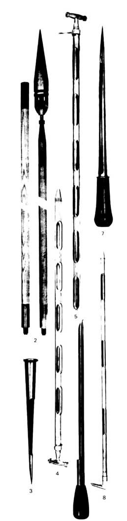 Sondes. (Doc. Tripette et Renaud.) 2 SONDE à BATEAU, POUR GRAINS, 3 SONDE à GRAINS, 4 SONDE MANUTENTION, 5 SONDE EN CUIVRE POUR GRAINS, 6 SONDE à PULVÉRULENTS, 7 SONDE à CACAO, SONDE à CAFÉ, 8 CANNE SONDE EN CUIVRE POUR GRAINS, |