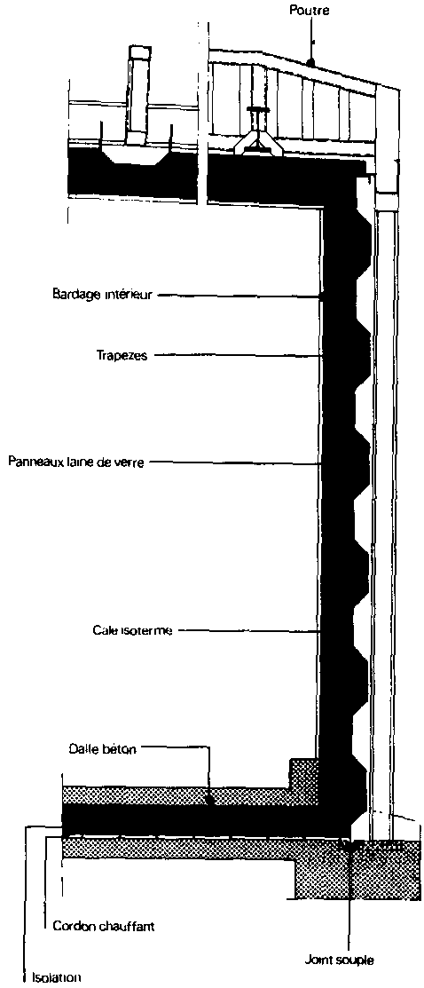 Une société spécialisée dans la construction de cellules métalliques étanches propose une technique intéressante de construction d'entrepôts frigorifiques de grandes dimensions. Les éléments préfabriqués métalliques sont assemblés par soudure et constituent des enceintes étanches. Les parois sont isolées intérieurement par deux couches de laine de verre recouverte d'un bardage intérieur en acier galvanisé ou en aluminium.