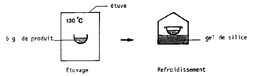 Un échantillon de 5 g de produit broyé est placé dans une étuve a 130° C. Après un étuvage de 2 ou 4 h (maïs) l'échantillon est placé dans un récipient contenant un produit dessiocateur (gel de silice) et laissé à refroidir pendant 45 nui. Il est alors pesé à nouveau.