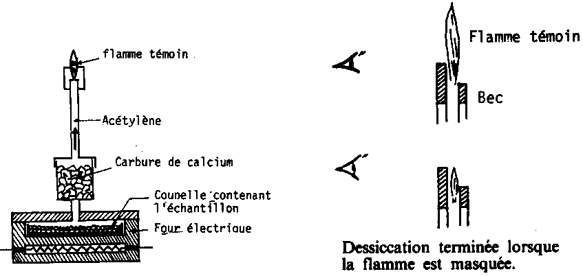 Cet appareil sèche à 160° C - 200° C un échantillon de quelques grammes (5 à 10 g) dans un petit four électrique, l'eau évaporée traverse une cartouche de carbure de calcium avec lequel elle réagit pour former de l'acétylène qui est brûlé au niveau d'un bec. Lorsque la flamme disparaît la déshydratation est terminée. La coupelle contenant l'échantillon est retirée et laissée à refroidir avant d'effectuer une seconde pesée sur une balance propre à l'appareil dont le fléau est directement gradué en pourcentages d'humidité.