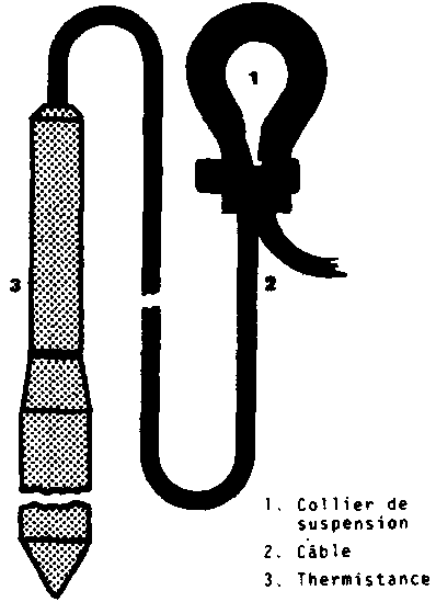 Le capteur de température se compose de la thermistance (sphère de 3 mm de diamètre en semi-conducteur par exemple) et de ses deux conducteurs de raccordement. Le tout est noyé dans une canne en fibre de verre de très grande rigidité mécanique (coefficient de rupture supérieur à plusieurs tonnes) et de faible diamètre (6 mm), ce qui permet d'enfoncer les sondes jusqu'à 4 m de profondeur sans effort particulier ou de les fixer au plafond avec des dispositifs d'ancrage simplifiés.