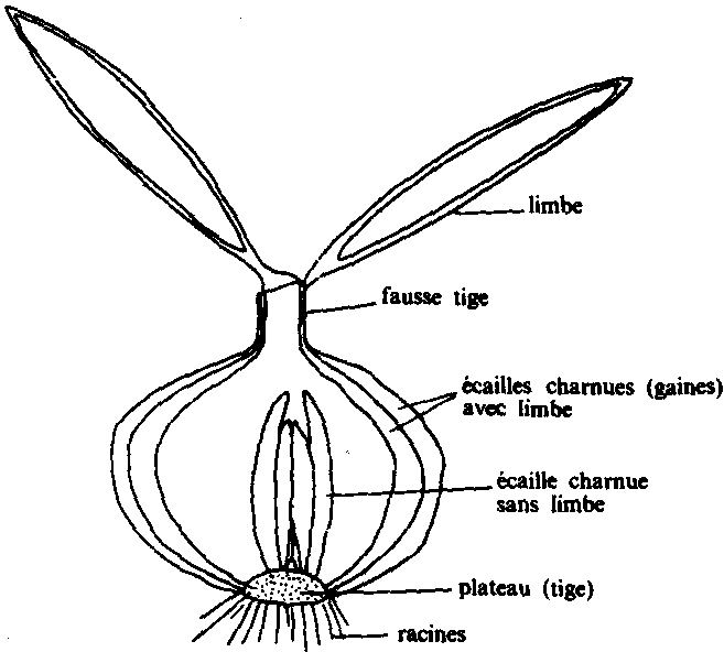 L'oignon est constitué d'une tige très courte, appelée plateau, qui porte des racines et qui donne naissance à des feuilles avec gaine et limbe; les feuilles, emboîtées les unes dans les autres, vent s'épaissir dans leur partie inférieure et former un bulbe; les parties supérieures des gaines restent serrées et forment une fausse tige appelée collet. Du bulbe s'échappent les limbes des feuilles externes, qui forment la partie verte de la plante. Cette formation du bulbe est appelée la tubérisation. Lors de la maturation du bulbe, le collet va se ramollir, les feuilles vertes se coucher sur le sol puis jaunir. Le bulbe entre alors en dormance.